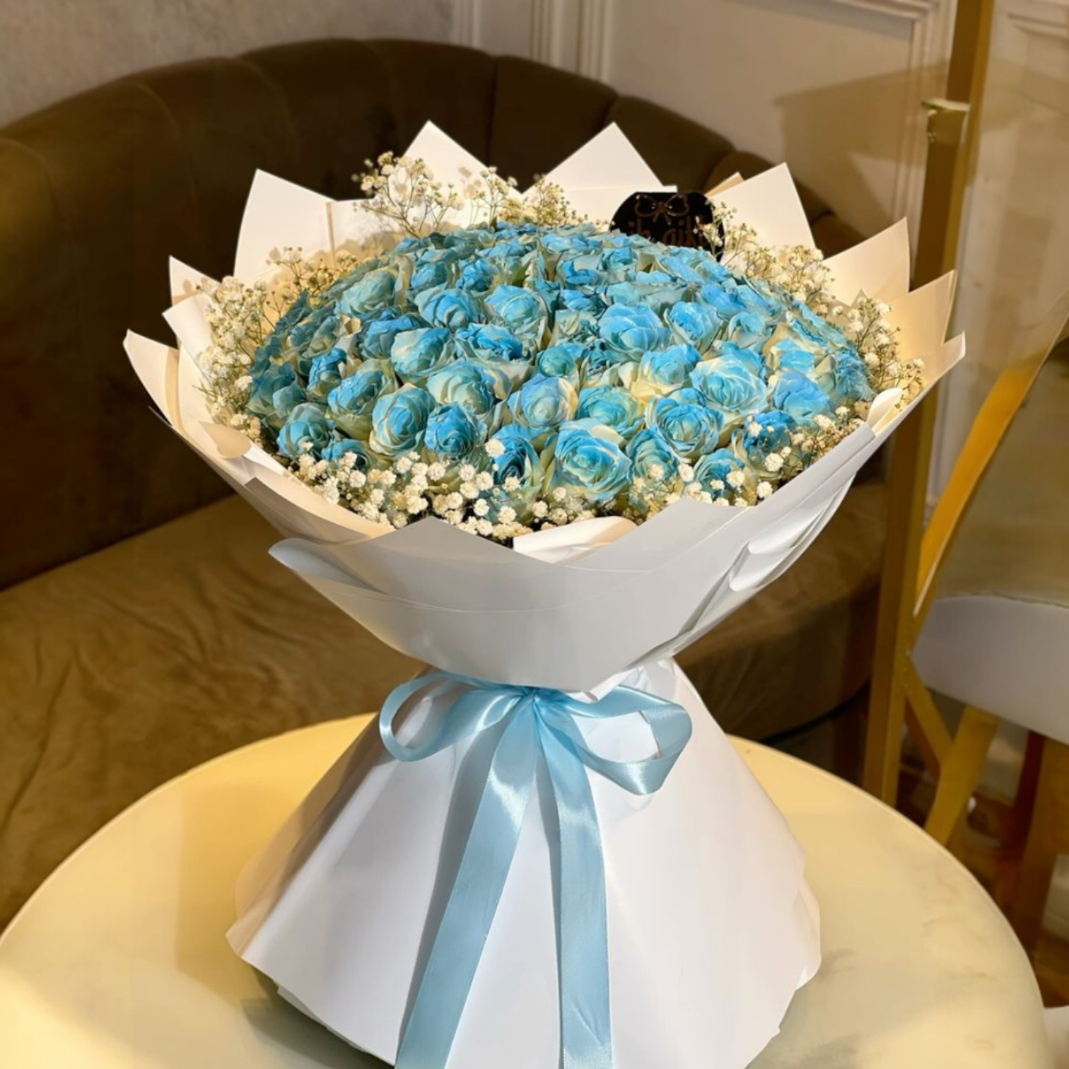 A luxurious bouquet featuring preserved blue roses accented with baby’s breath and premium wrapping — designed to last and leave a lasting impression.