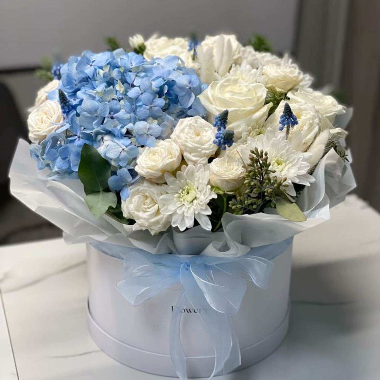 A refined mix of white roses, white chrysanthemums, blue hydrangea, and delicate fillers, arranged in a premium white hatbox with a soft blue ribbon.