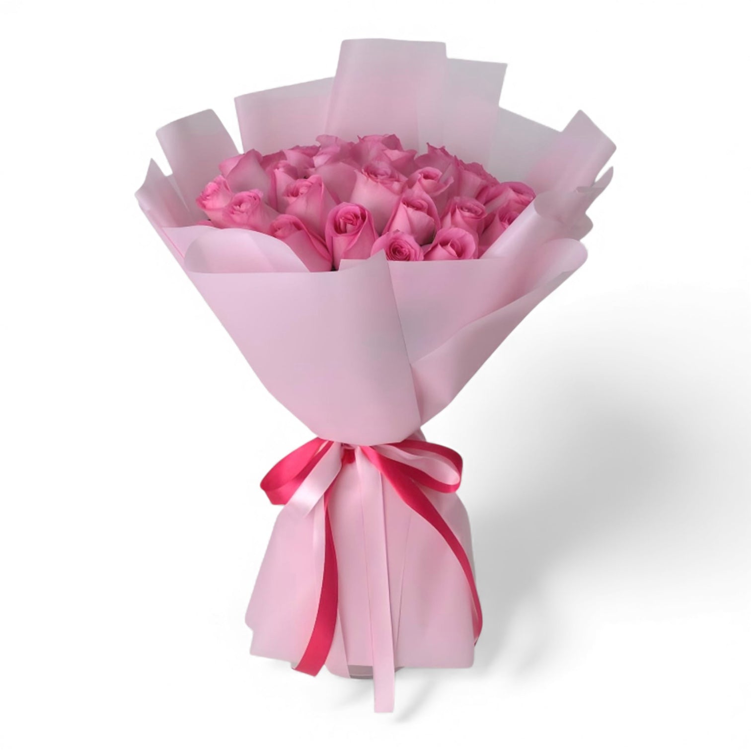 This charming arrangement includes 25 freshly handpicked pink roses, each chosen for its soft hue, velvety petals, and refined elegance. Wrapped in delicate light pink paper, the bouquet showcases a harmonious monochrome design that feels tender, feminine, and effortlessly graceful.