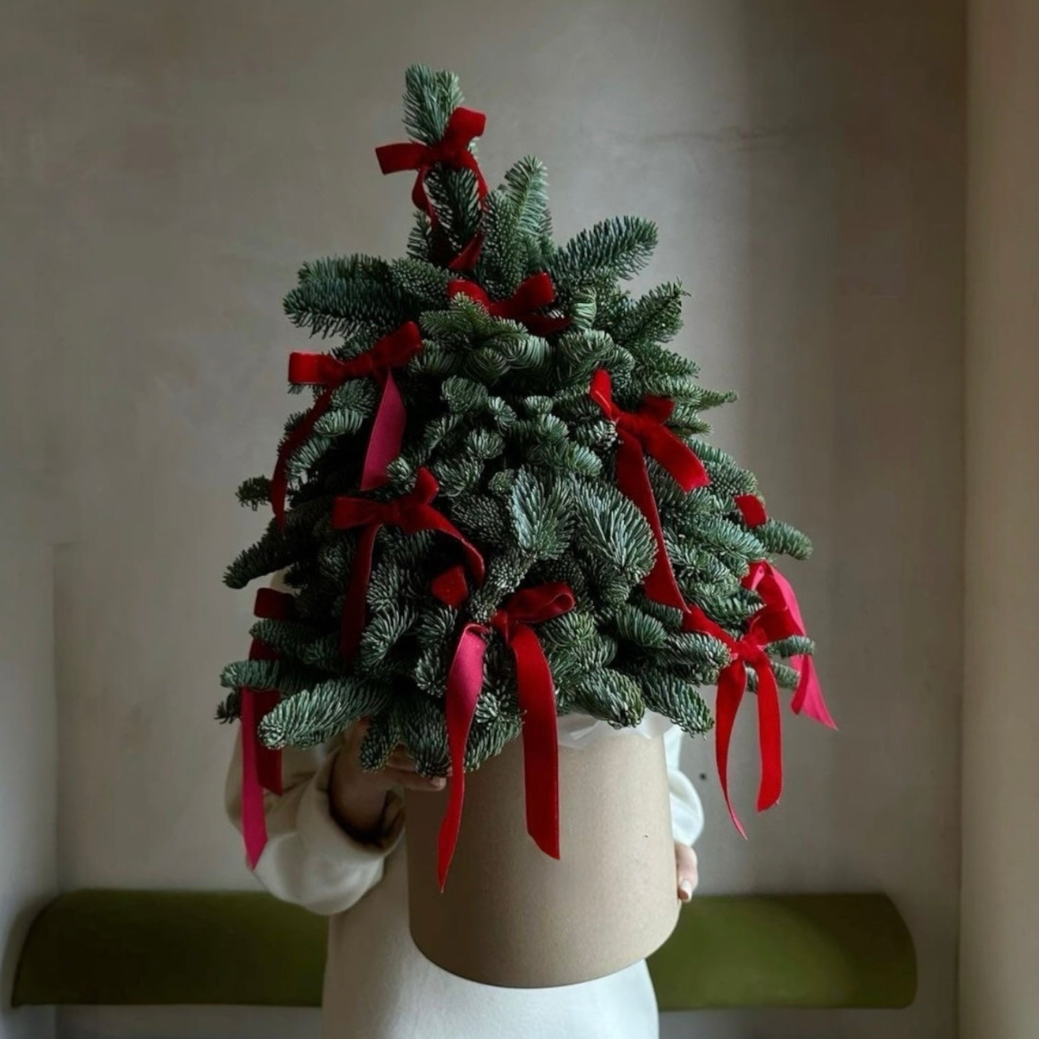Bring festive charm into any space with this beautifully handcrafted Mini Evergreen Christmas Tree. Made from fresh, lush fir branches and adorned with elegant red ribbon bows, this compact arrangement is perfect for tabletops, desks, or cozy corners that need a touch of holiday magic. Its natural texture and minimalist style make it a warm, modern addition to your seasonal décor. Presented in a simple box, it blends effortlessly with any interior while adding a cheerful Christmas spirit. A lovely gift or a delightful treat for your own home!
