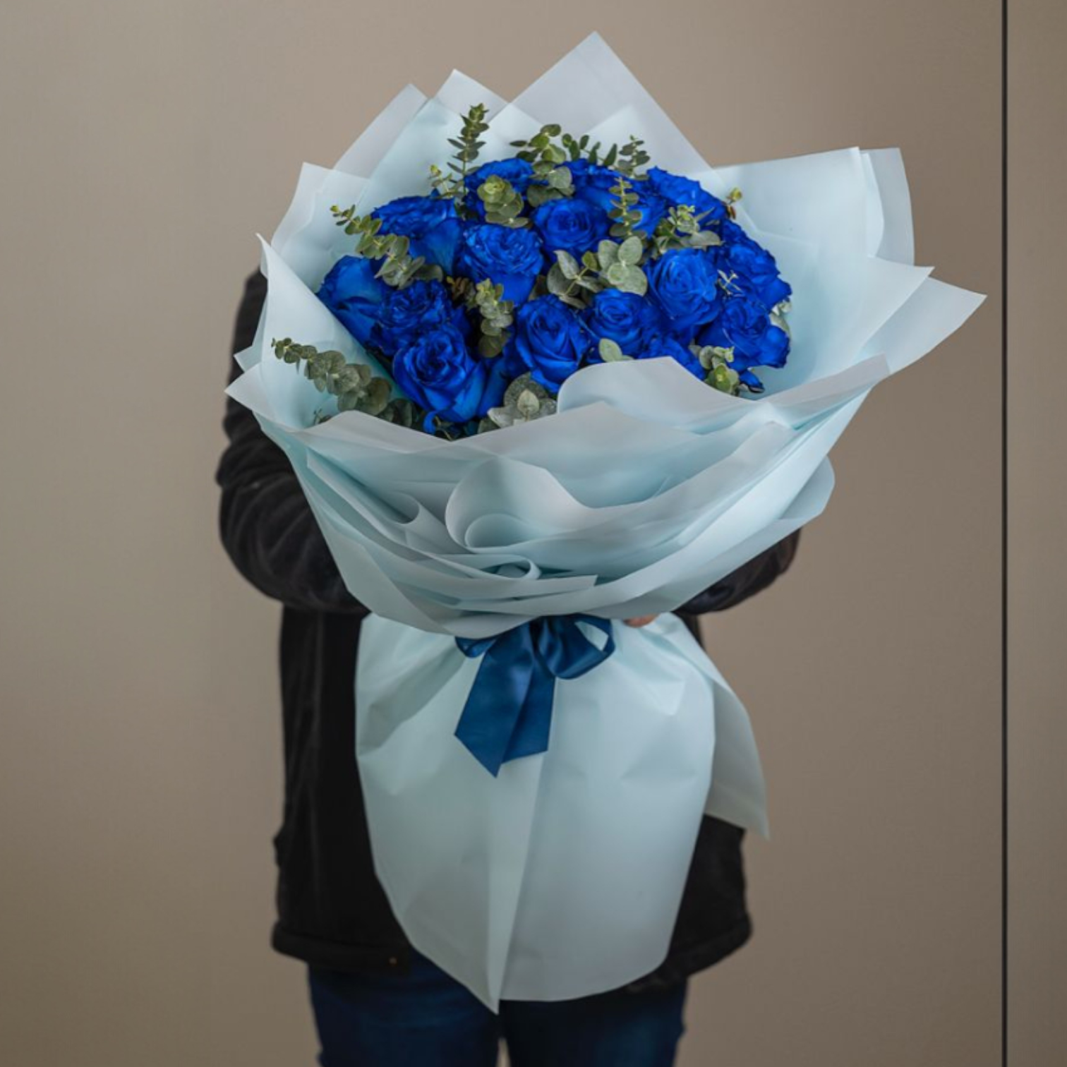 A luxurious hand-tied bouquet of premium blue roses accented with fresh eucalyptus foliage, wrapped in soft pastel blue layers and tied with a satin ribbon. Elegant, modern, and visually stunning.