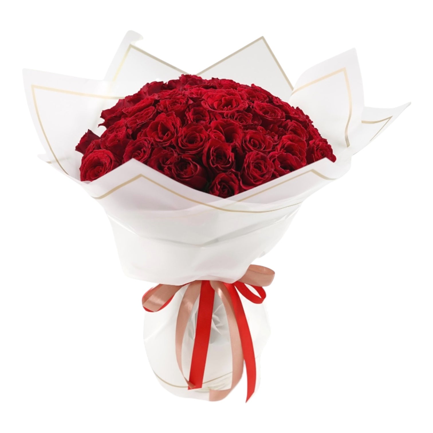 This exquisite arrangement showcases 55 premium red roses, hand-selected for their rich color, velvety petals, and lasting freshness. Wrapped in elegant white paper, the contrast highlights the roses’ natural beauty, creating a striking and sophisticated presentation.