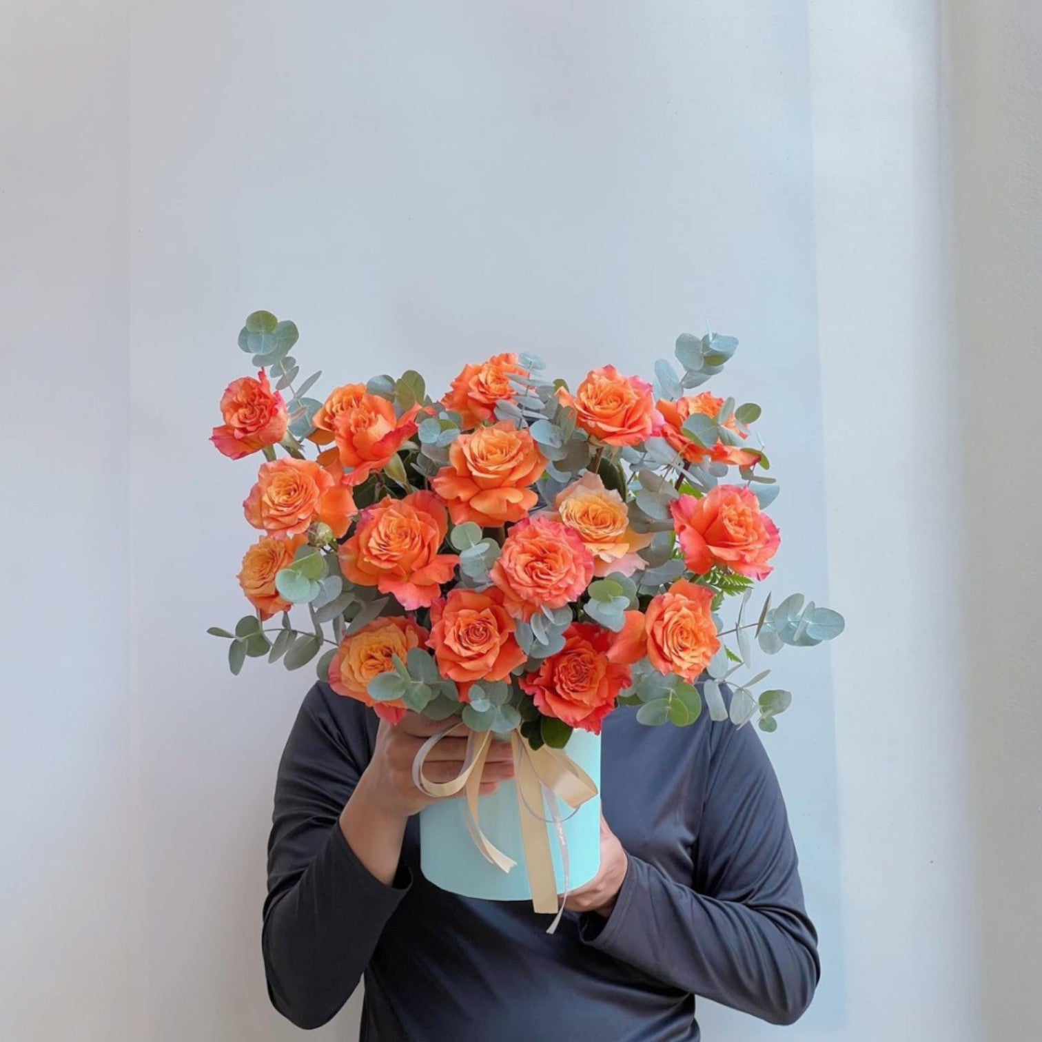 Brighten any space with the radiant charm of our Sunset Bloom Luxe Box. This premium floral arrangement features a stunning array of vibrant orange roses, artfully paired with fresh eucalyptus leaves for a modern and refreshing contrast. Hand-arranged in a stylish pastel hatbox with a soft satin ribbon, this bouquet exudes elegance, joy, and warmth.