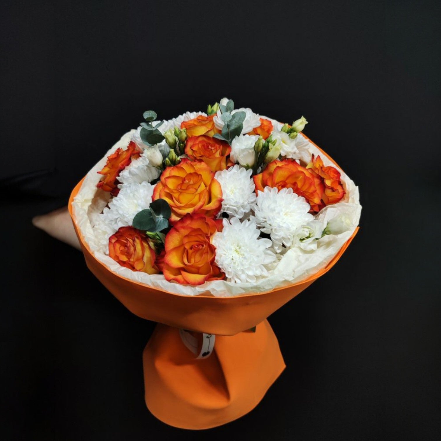 Includes: Orange roses, white chrysanthemums, white lisianthus, and eucalyptus accents